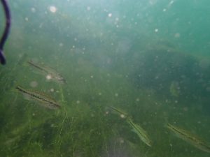 とりあえず、チチブのでかいのがそこらじゅうにいたのと、ビワコヨシノボリは小さいのがチョコチョコたくさんいた感じです。あとブルーギルもたくさん大きいのがいたのですが、ブラックバスが群れでたくさん泳いでました。なんか水中もわいわいしている感じです。あと水面の方には鮎もいっぱい泳いでました。