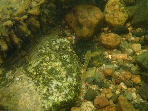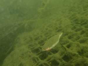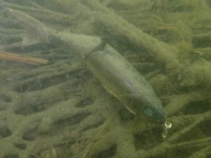とにかく思ったよりも水温は高く15度ぐらいありましたよ。湖底を安定させるために、ロープでできた網に石を詰めたものが沈めてあり、そのロープのところにいっぱいルアーが根掛かりしていました。中には数万円するルアーがあることを釣り愛好家の人たちに教えてもらい。僕が釣り人ならそんな高価なルアーを無くしたらショックで2〜3日は落ち込んでしまうだろうなと思ってしまいました。